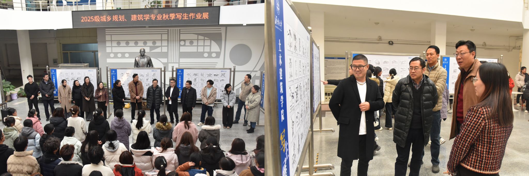 为激发学生专业学习热情,全面检验教学实践成果,持续强化学风建设,12月4日下午,我院在第八教学楼大厅举办2025级城乡规划与建筑学专业秋季写生作业展开幕式。学院领导班子成员、城乡规划系及建筑系教师代表、学生工作人员、2025级城乡规划、建筑学专业全体学生共同参加活动。开幕式由党委副书记、副院长李健慧主持。
