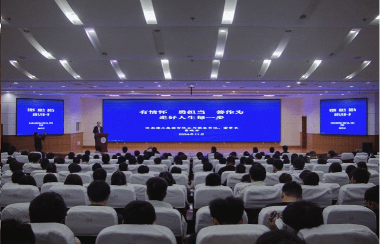 曹晓岩董事长结合自身深耕建筑行业三十余年的经历,为同学们带来了主题鲜明、内涵丰富的就业指导讲座。他首先系统介绍了济南四建的发展历程、业务布局与核心优势,重点分享了企业在房屋建筑、国际工程、钢结构施工等领域的突出成果——从参与4000多项国家和省市重点工程,到远赴佛得角、汤加等国承建大使馆工程,从11项“鲁班奖”的辉煌业绩到“全国五一劳动奖状”的荣誉加持,让同学们深刻感受到建筑企业的责任与担当。